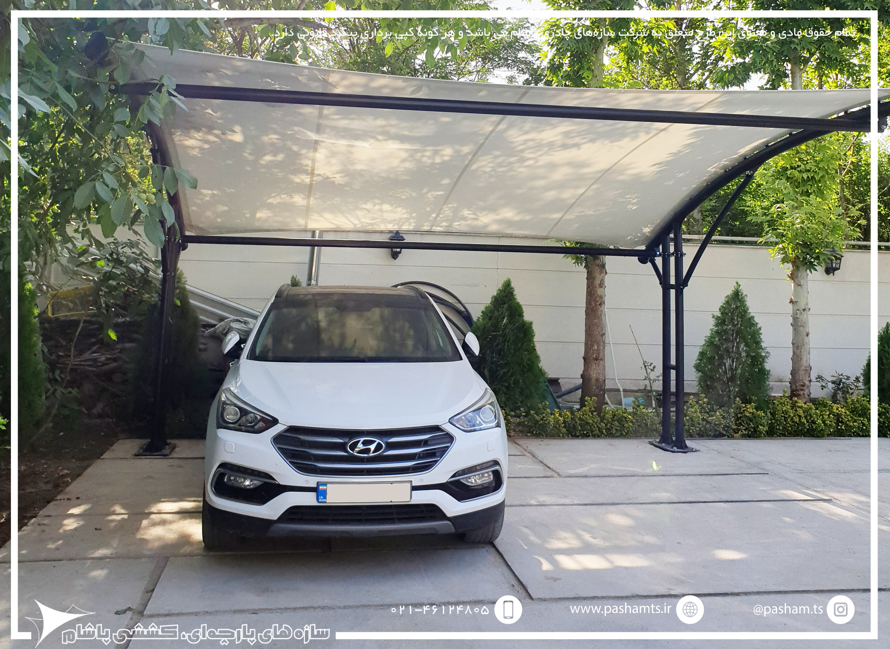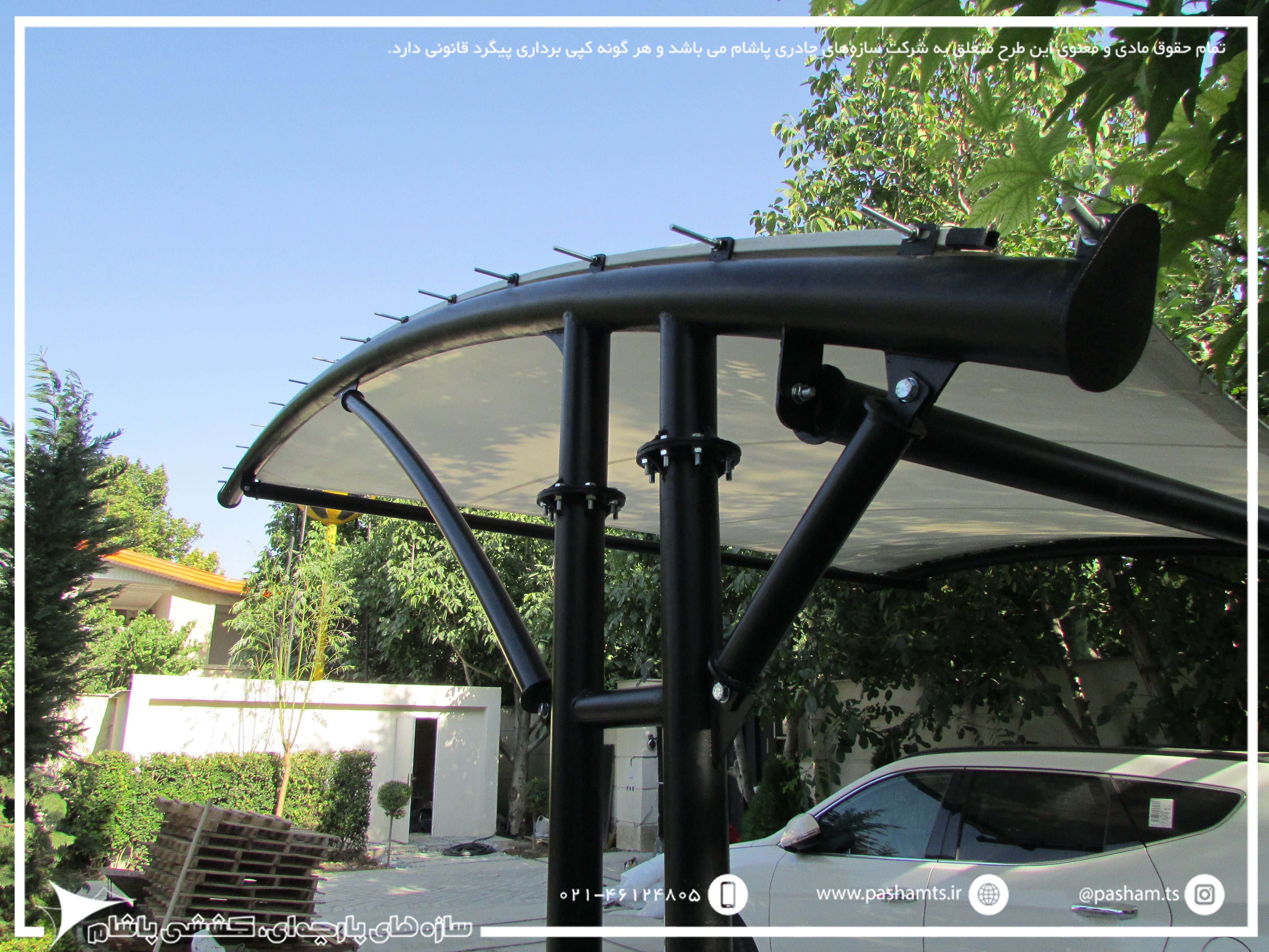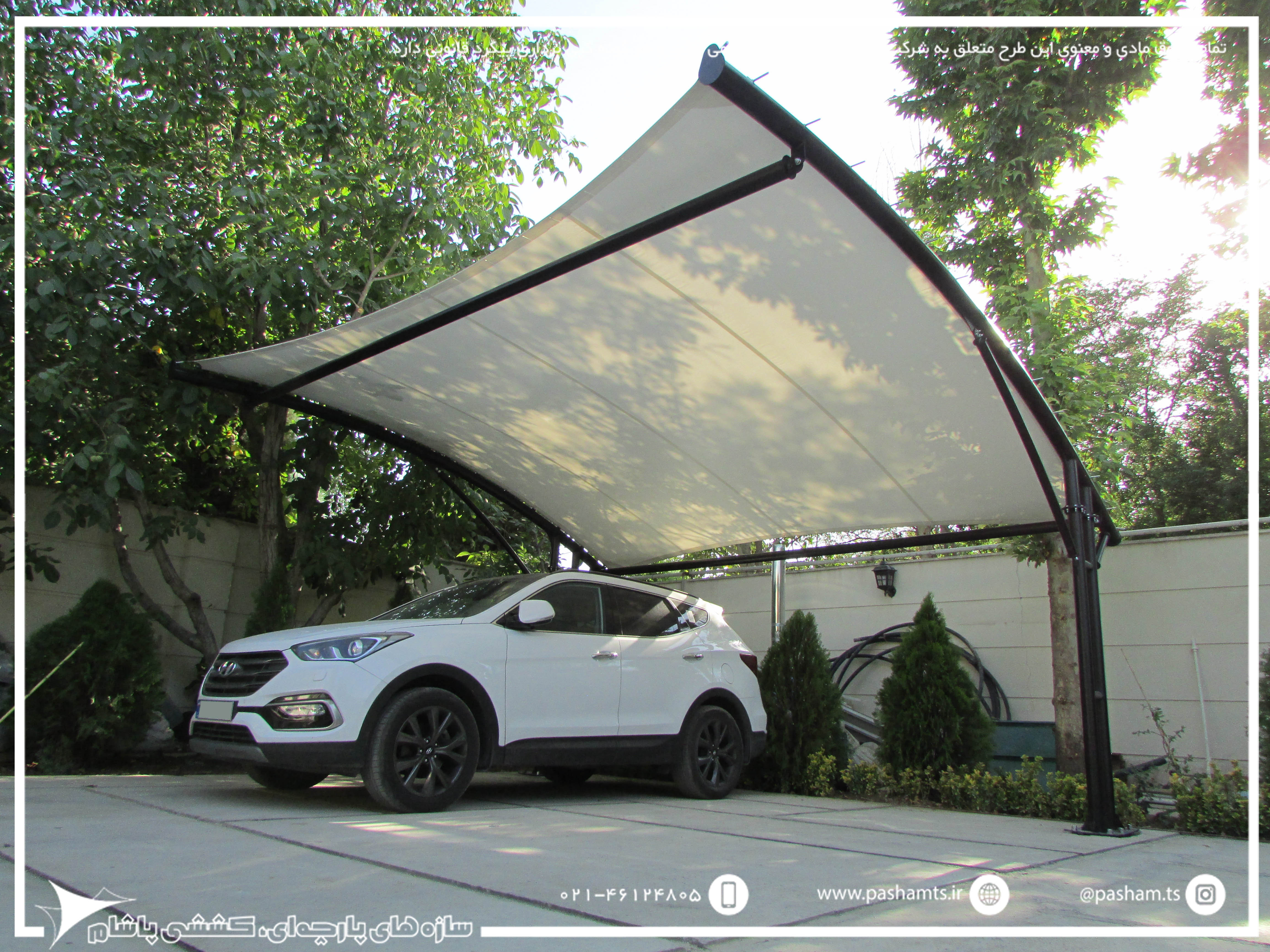 این پروژه شهرک باغستان کوشک، صفادشت در استان تهران اجرا و نصب گردیده است. کل مدت زمان از سفارش تا نصب این پروژه کمتر از 20 روز انجام شده است که با توجه به نداشتن ستون مزاحم برای سایبان پارکینگ بسیار مناسب می باشد و با توجه به معماری مدرن ویلا و محوطه سازه، سایبان پارچه ای بسیار ظاهر زیبا و جذابی پیدا کرده.