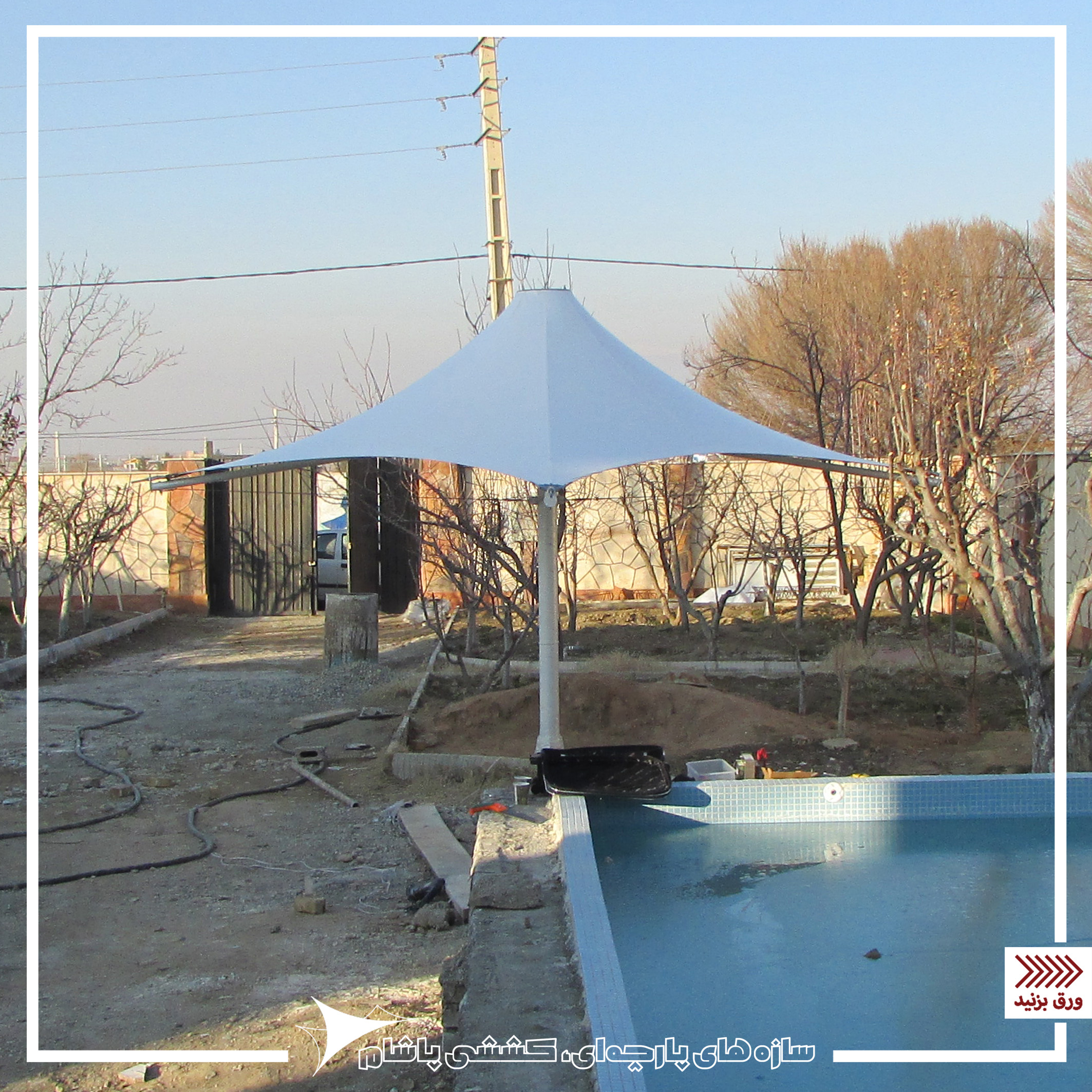 سایبان پارچهای متحرک در کنار استخر ویلا به فرم مخروطی به مکانیزم باز و بسته شونده طراحی شده تا بتوان در مواقع لزوم از سایه و پوشش آن استفاده نمود و یا از تابش خورشید بهره گرفت. این سایبان پارچهای به صورت تک ستون مرکزی طراحی شده تا ستون اشغال فضا کمتری داشته باشد و پارچه در هنگام بسته شدن در اطراف ستون قرار گیرد.سایبانهای متحرک به صورت باز و بسته میشوند (کمتر از یک دقیقه) و بسیار مقاوم در برابر بادهای شدید و برف های سنگین هستند.