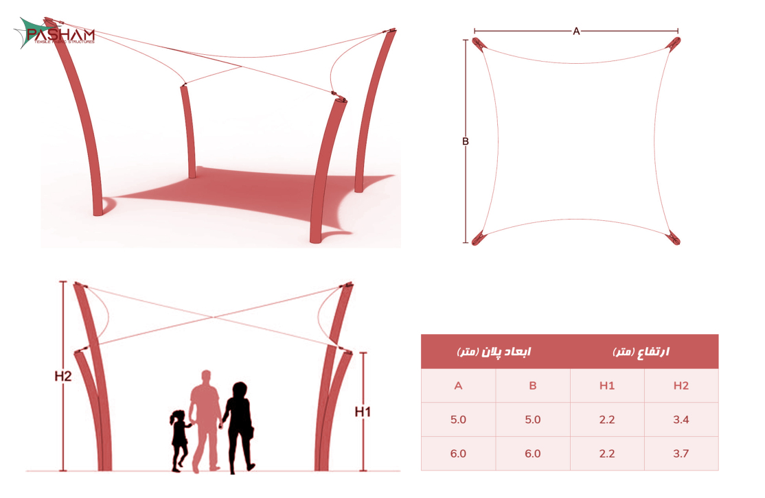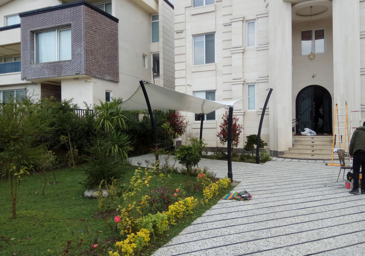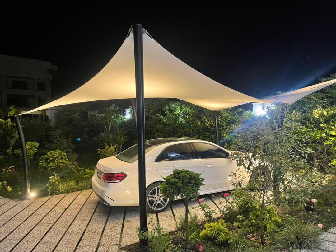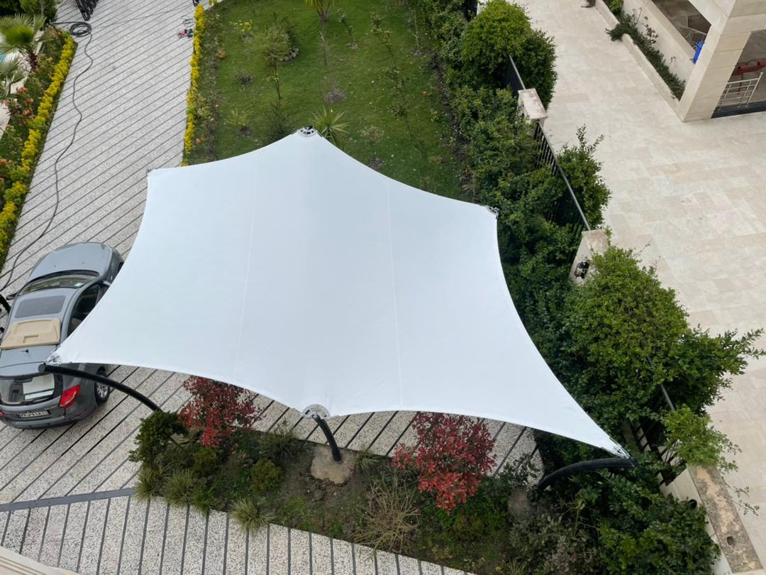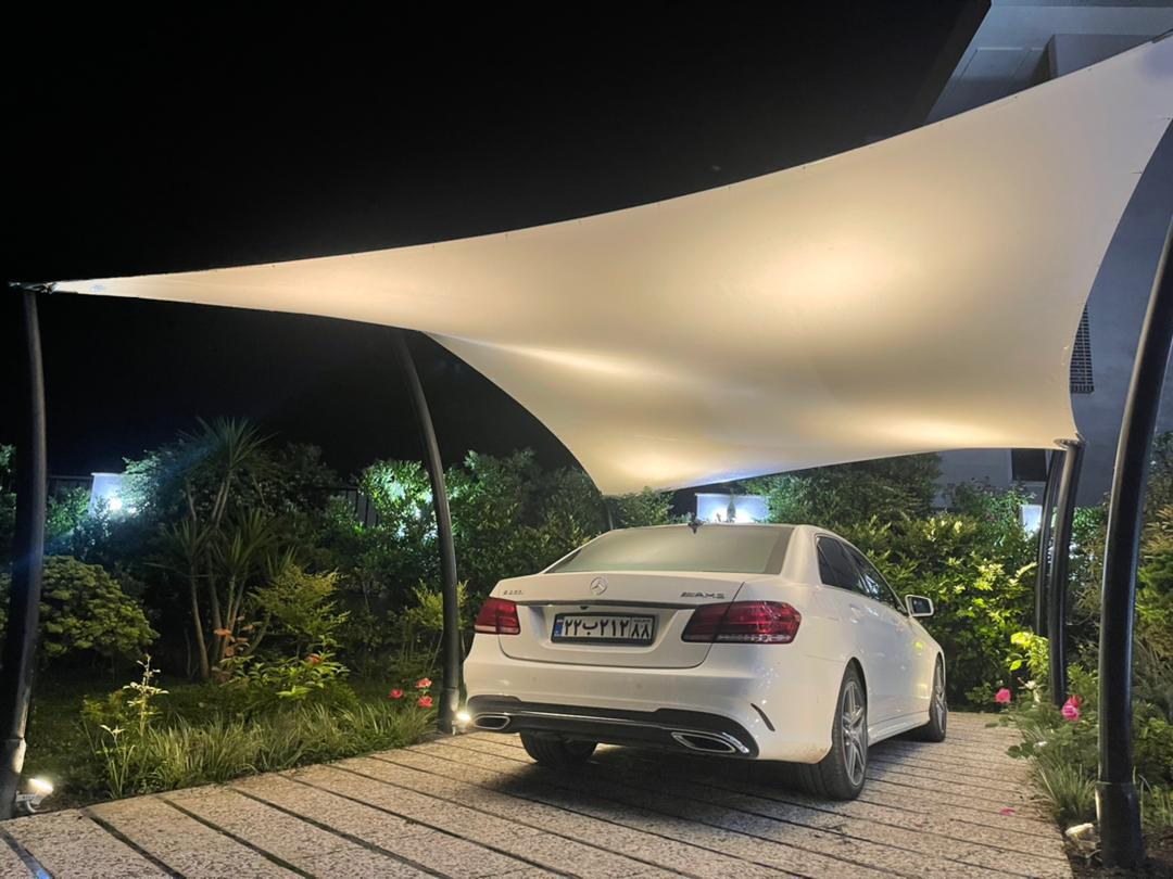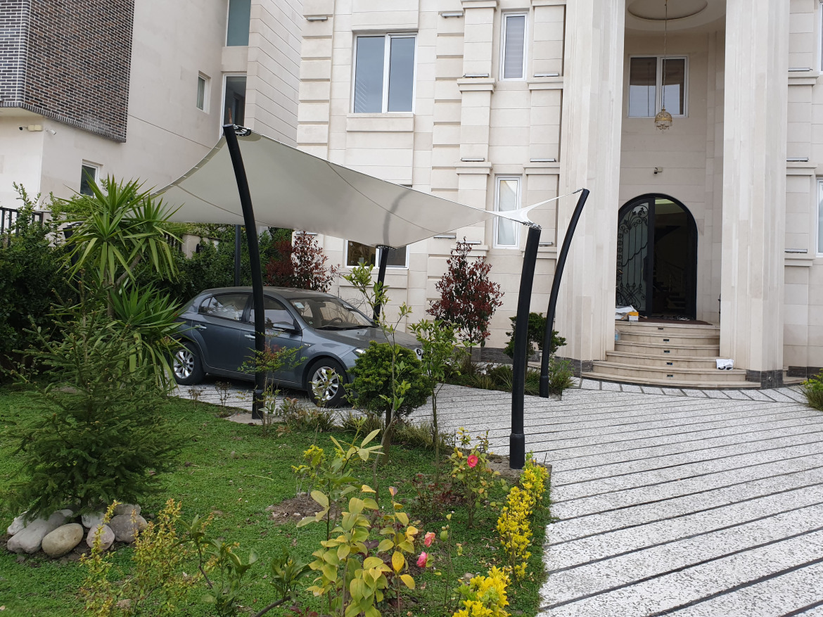 خزر پلاس سایبانی بدون تیر های افقی که به واسطه اختلاف ارتفاع در ستون ها، انحنا زیبایی در پارچه به وجود می آورد تا پوششی برای خودرو شما ایجاد کند.
