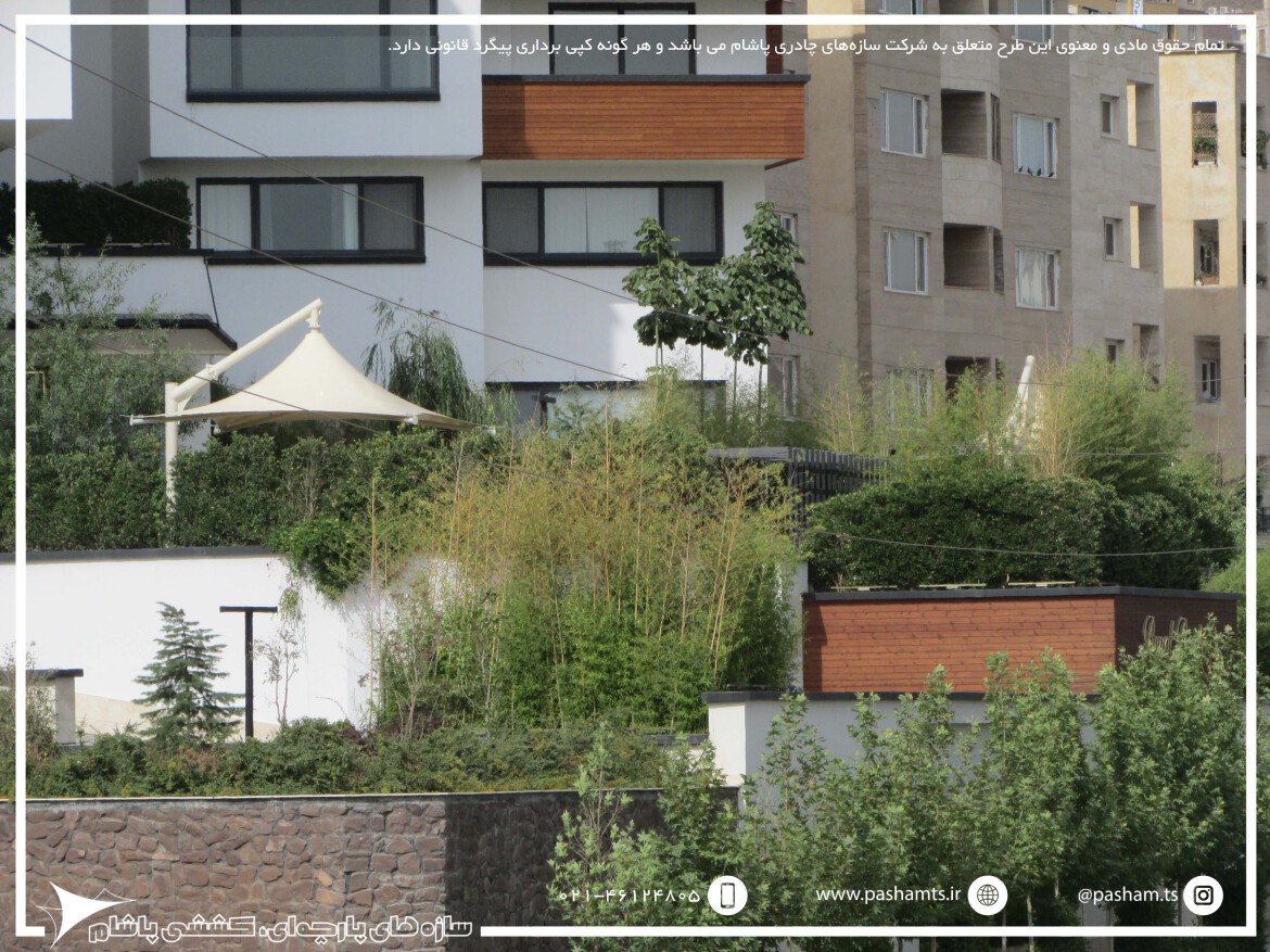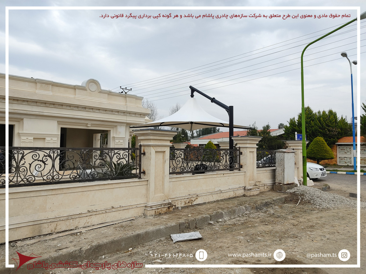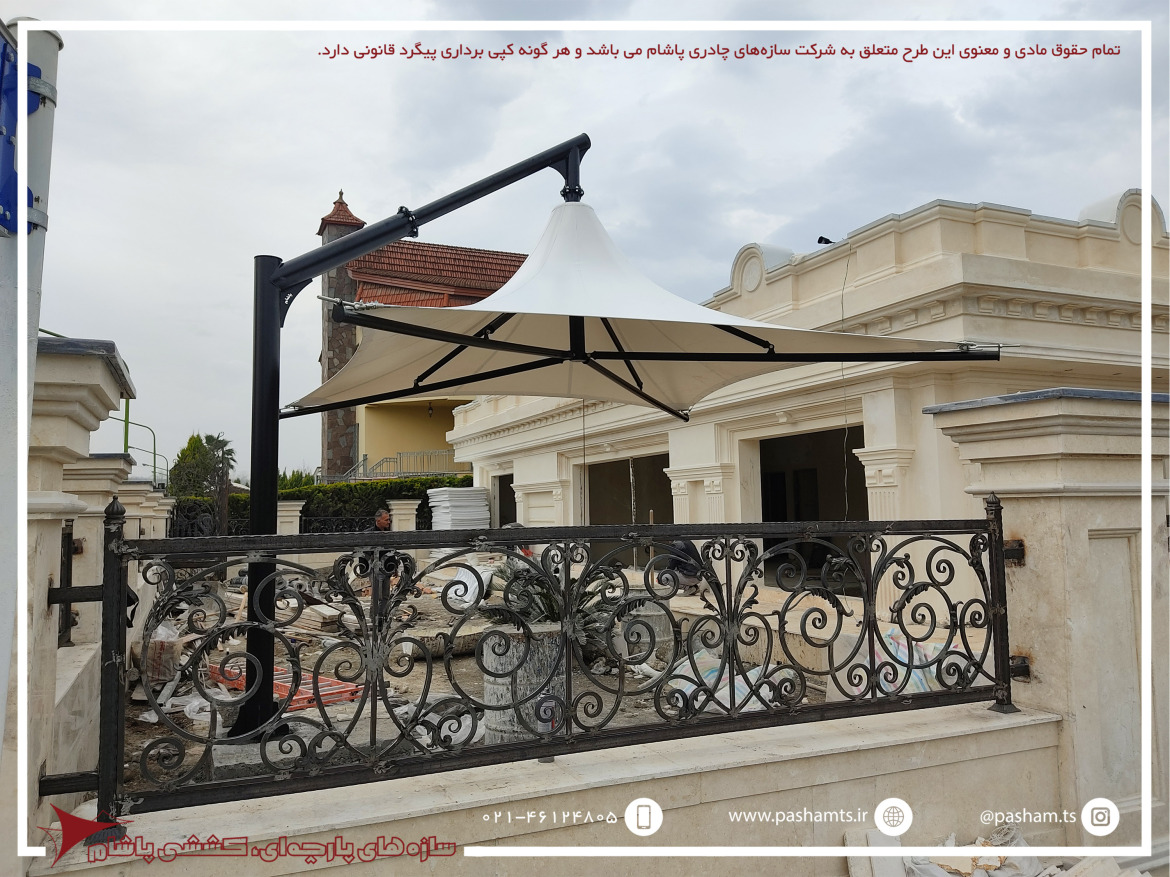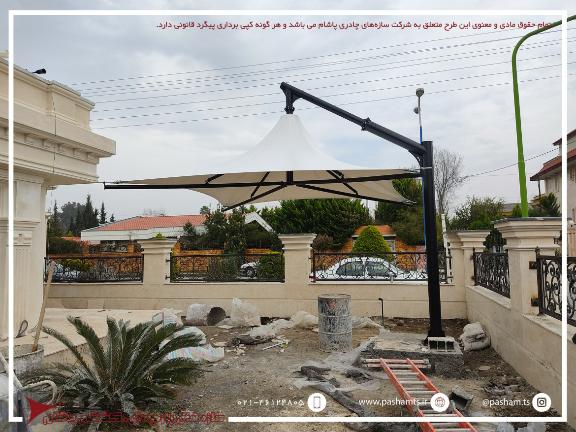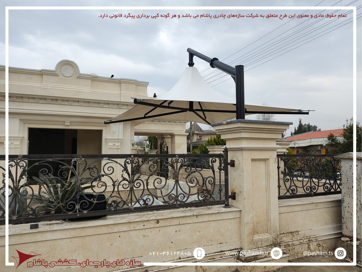سایبانی زیبا و کابردی با یک ستون در کنار سایبان که حداقل محدودیت فضایی و حداکثر کاربرد و زیبایی را به وجود می آورد.