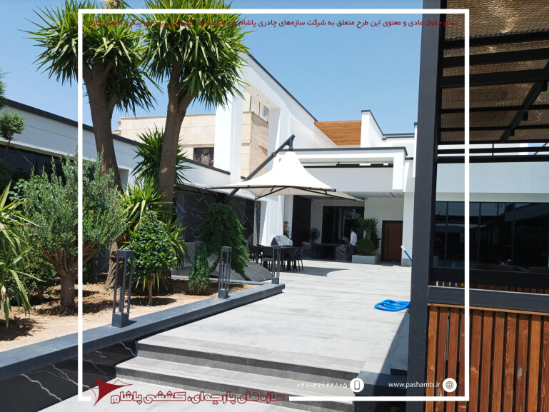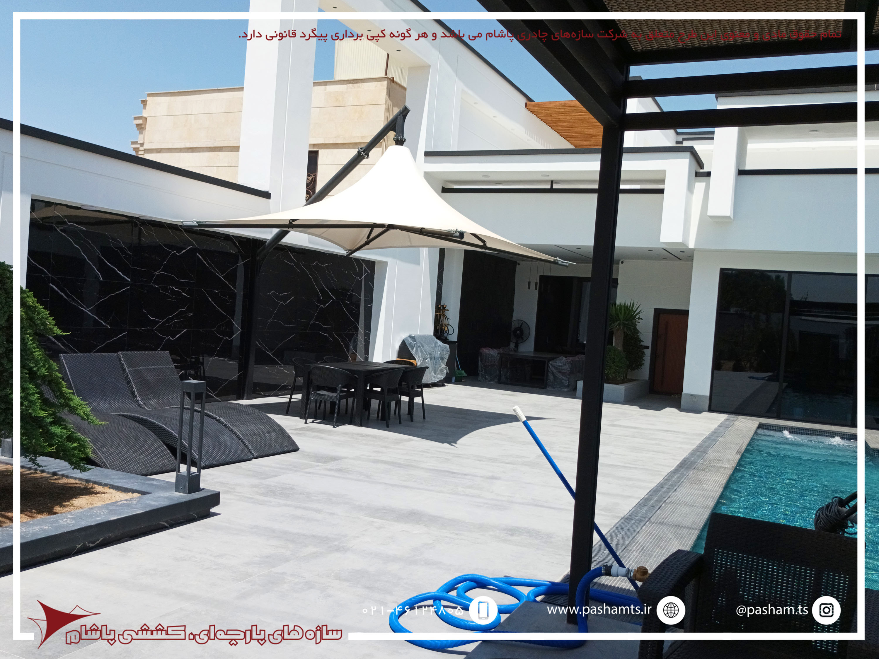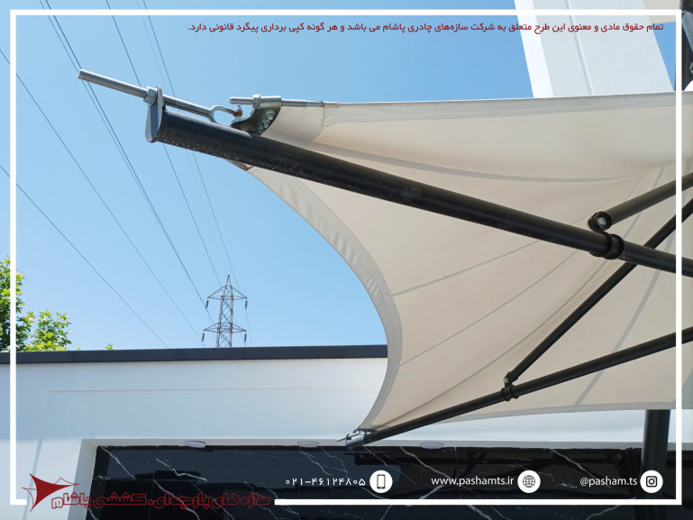 سایبان چادری مدل البرز پلاس یکی از زیباترین و کاربردی ترین مدل ها سایبان چادری مناسب برای فضا های نشیمن هستند که در پروژه چهارباغ با توجه به وجود ستون سازه ای در داخل دیوار دستک سازه به ستون موجود در دیوار متصل شده و کمترین محدودیت را در فضا ایجاد نموده، مدل البرز پلاس یکی از مناسبترین مدل ها برای این فضا بوده و عملا با قرار گیری ستون در کنار دیوار کاملا فضایی کاربردی را ایجاد کرده است.