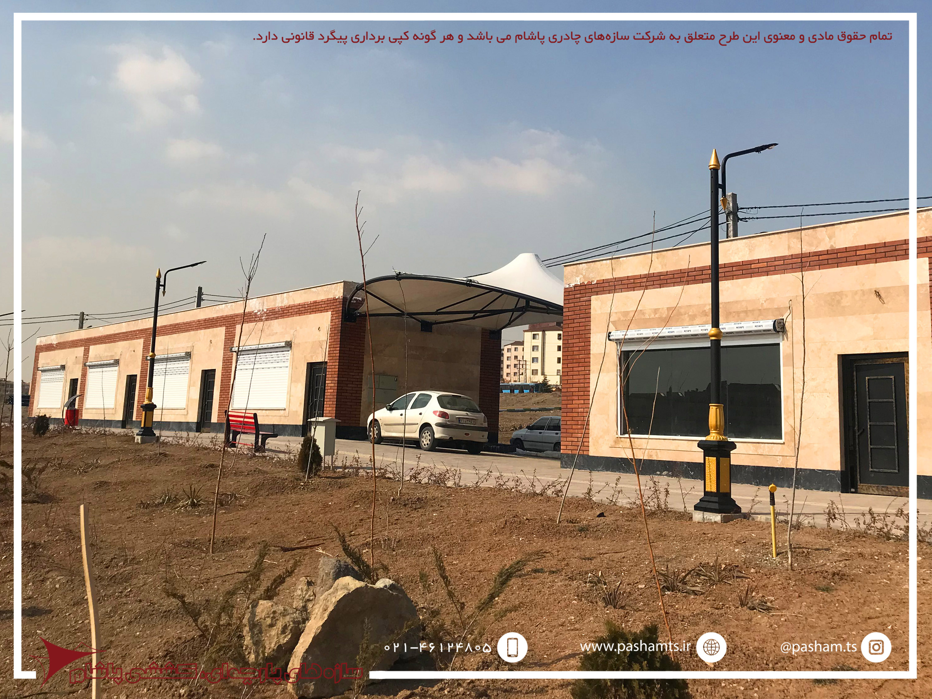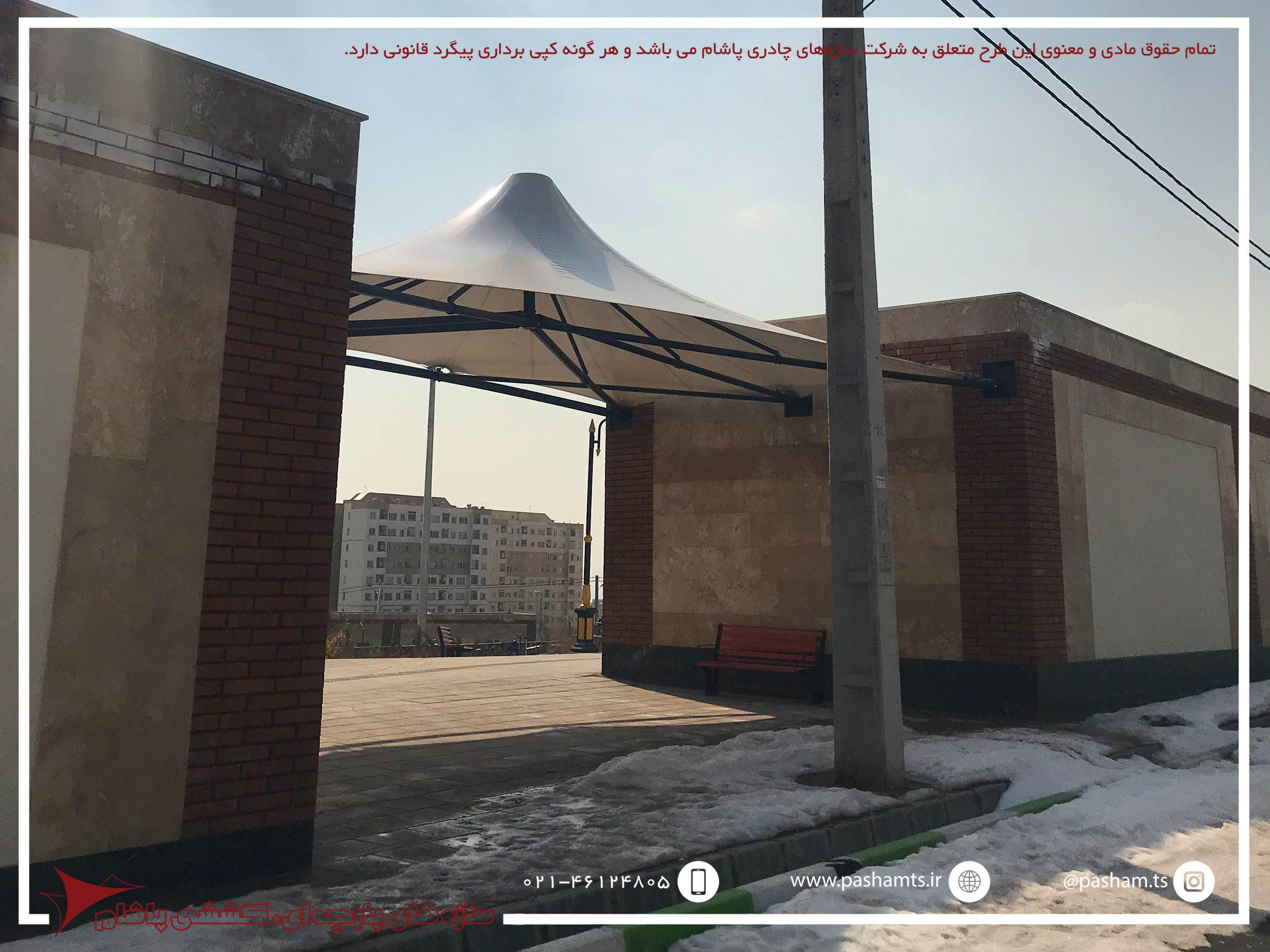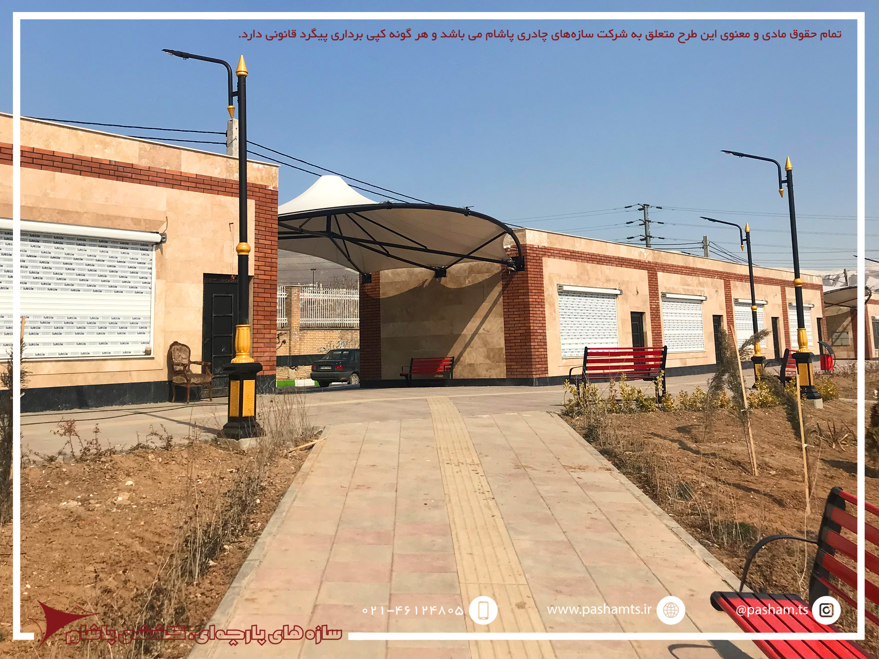 در پروژه بازارچه سنتی شهر پردیس ۳ سایبان با مساحت تقریبی ۱۶۰ متر مربعی در قسمت های میانی غرفه باعث ایجاد یکپارچگی مابین فضا ها و عملکرد های موجود شده تا بتوان در فصل های مناسب با قرار گیری عمکرد های موقت در کنار کاربری های دائمی فضایی با کیفیت تر را ایجاد نماید .